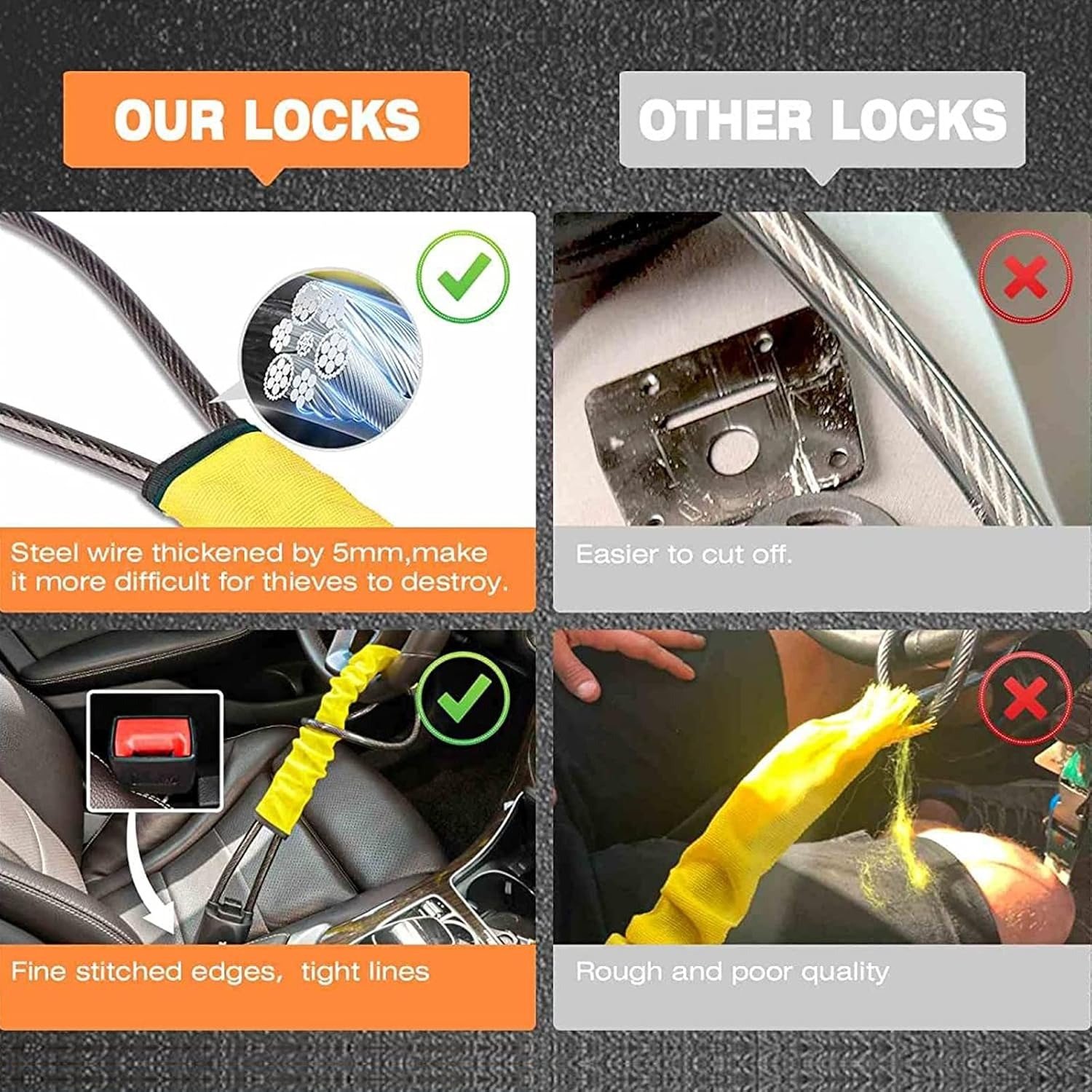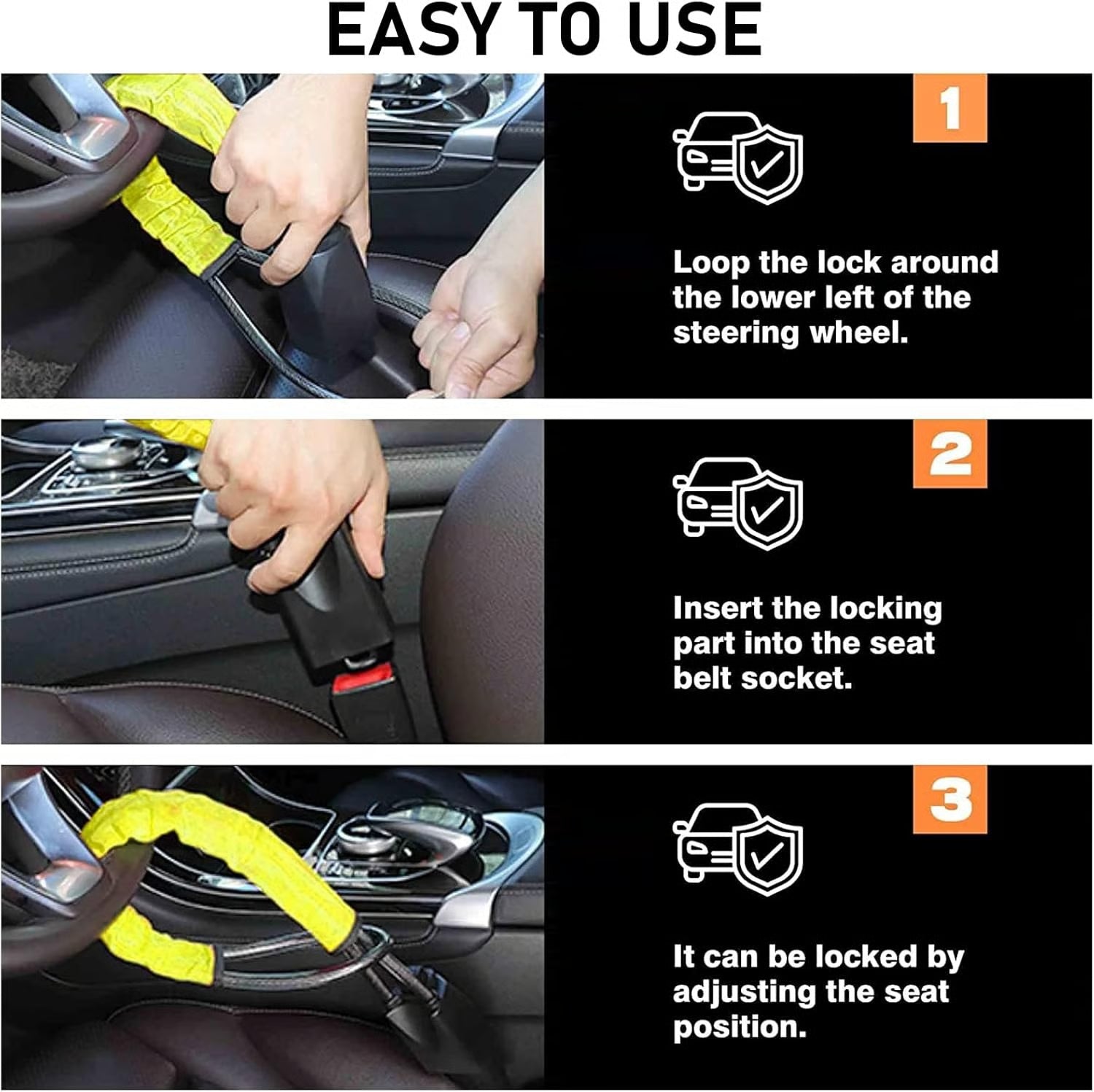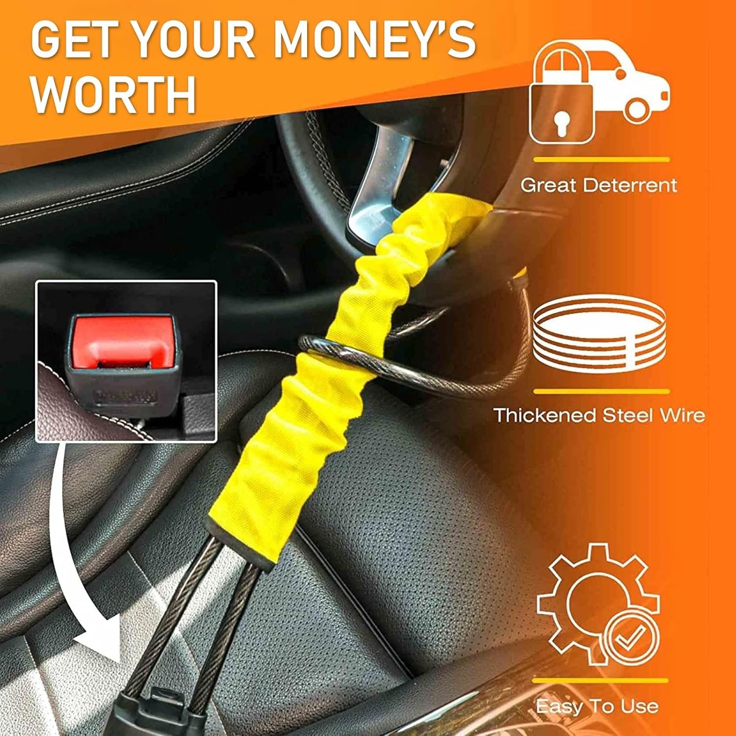 This steering wheel lock doesn't just protect your car; it also gives you a sense of security! Its high-strength construction creates an unbreakable barrier that simultaneously locks your steering wheel and seatbelt buckle. When thieves spot this eye-catching guardian, they'll think twice—it not only provides the ultimate visual deterrent but also fortress-like protection.