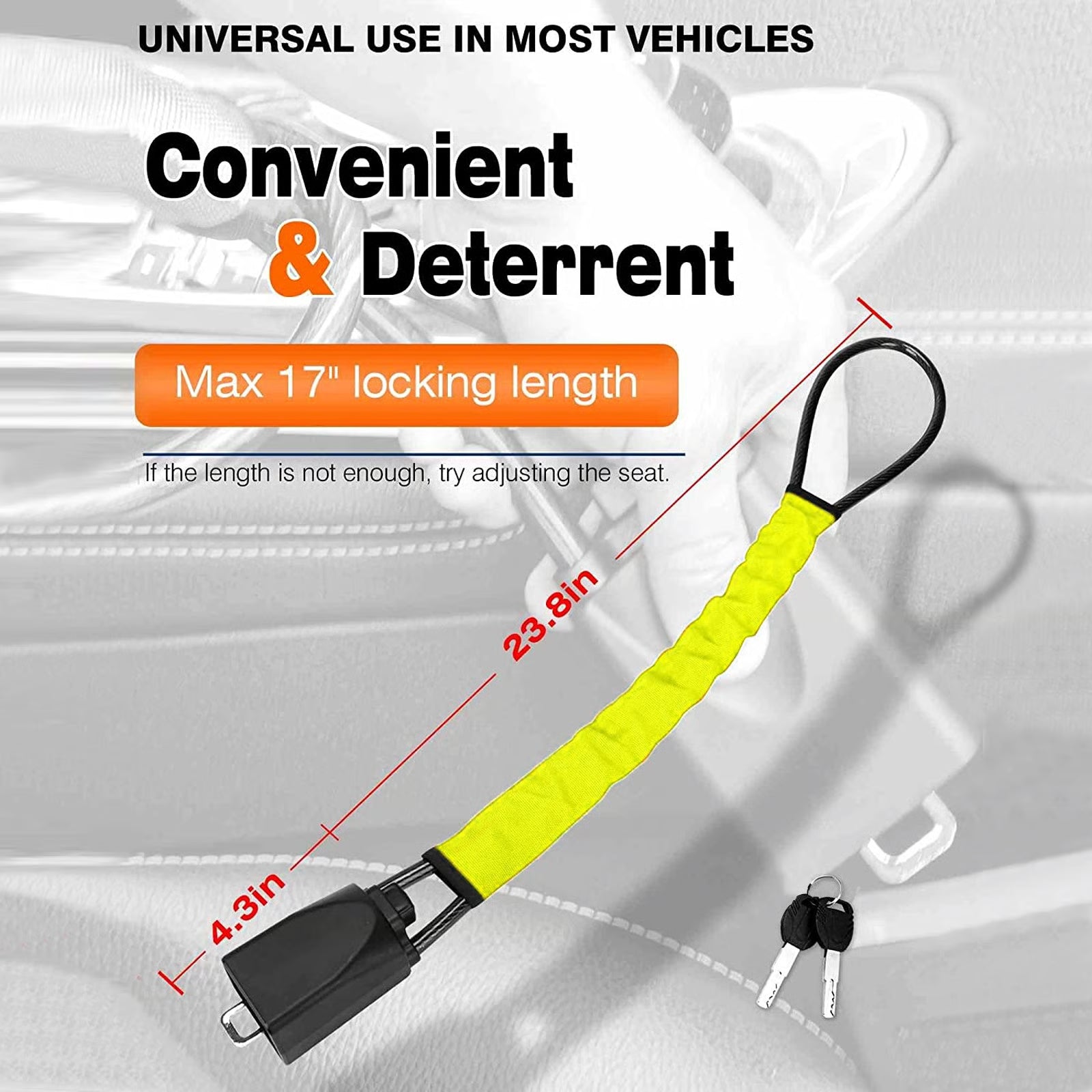 Our universal design features 17 inches of adjustable locking distance, making it compatible with nearly every vehicle on the road. Pro tip: Simply adjust your seat position to find the perfect fit. No more guesswork—just slide, lock, and drive away with peace of mind.