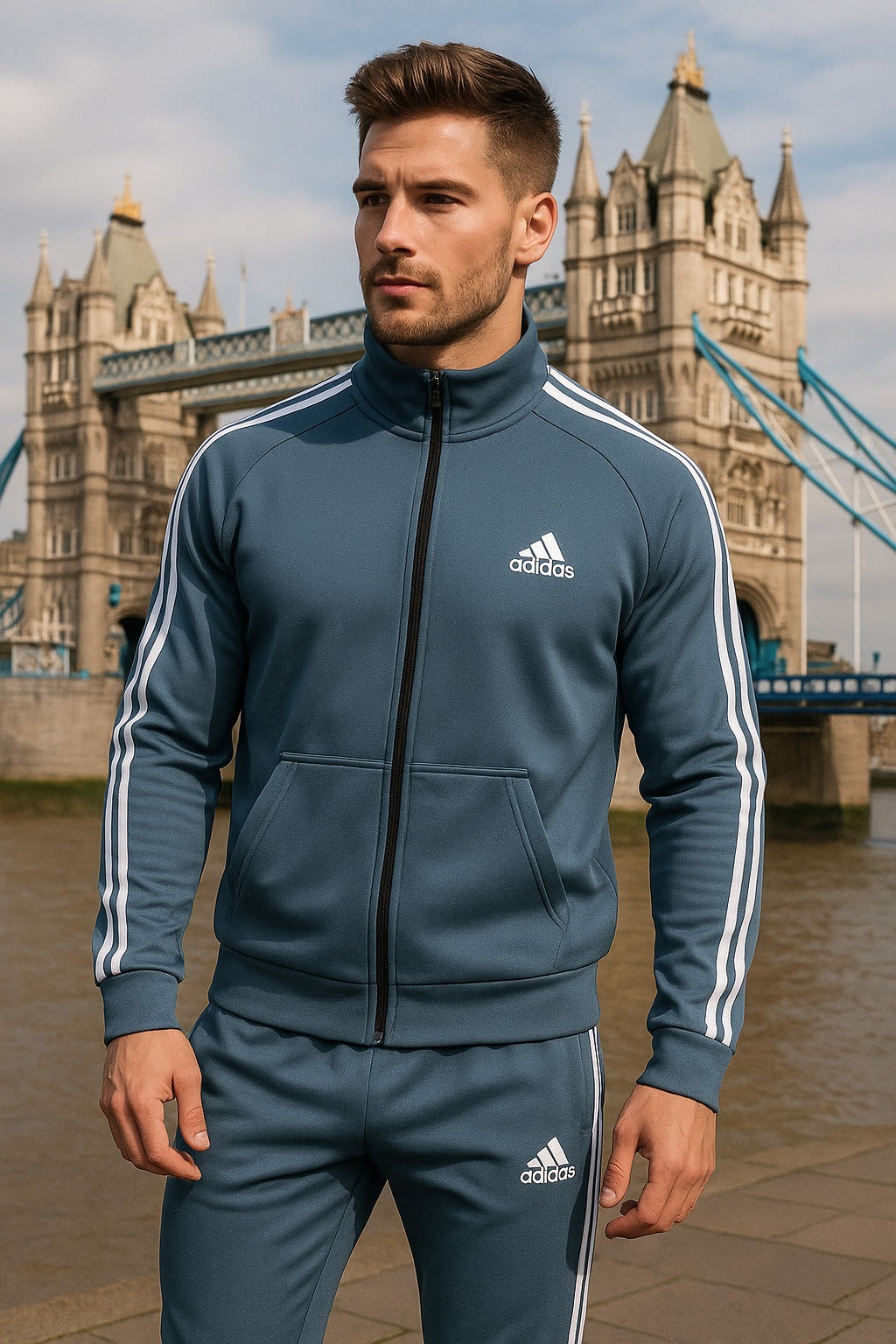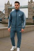 Classic white three stripes on the sleeves and sides of the pants