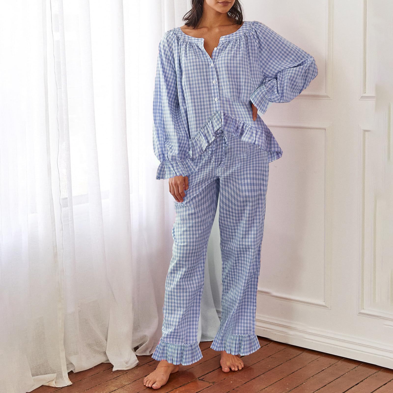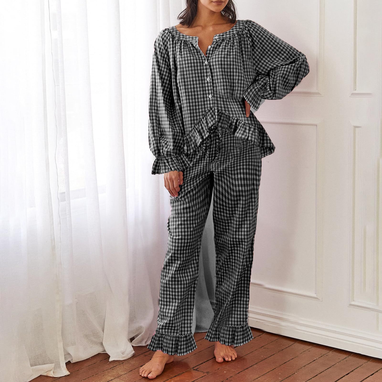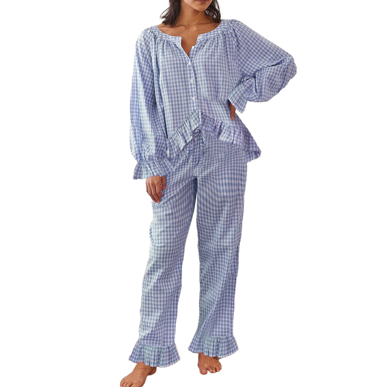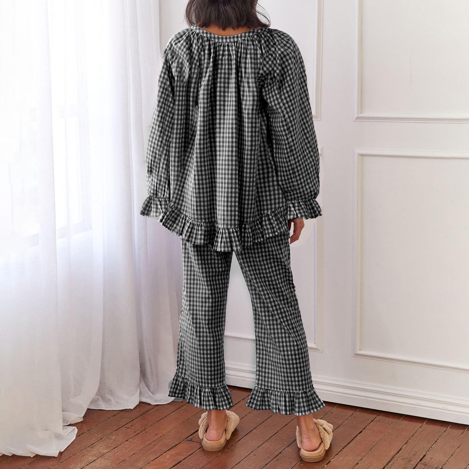Women's Casual Plaid 2-piece Set Short Sleeve Ruffled Top And Pants